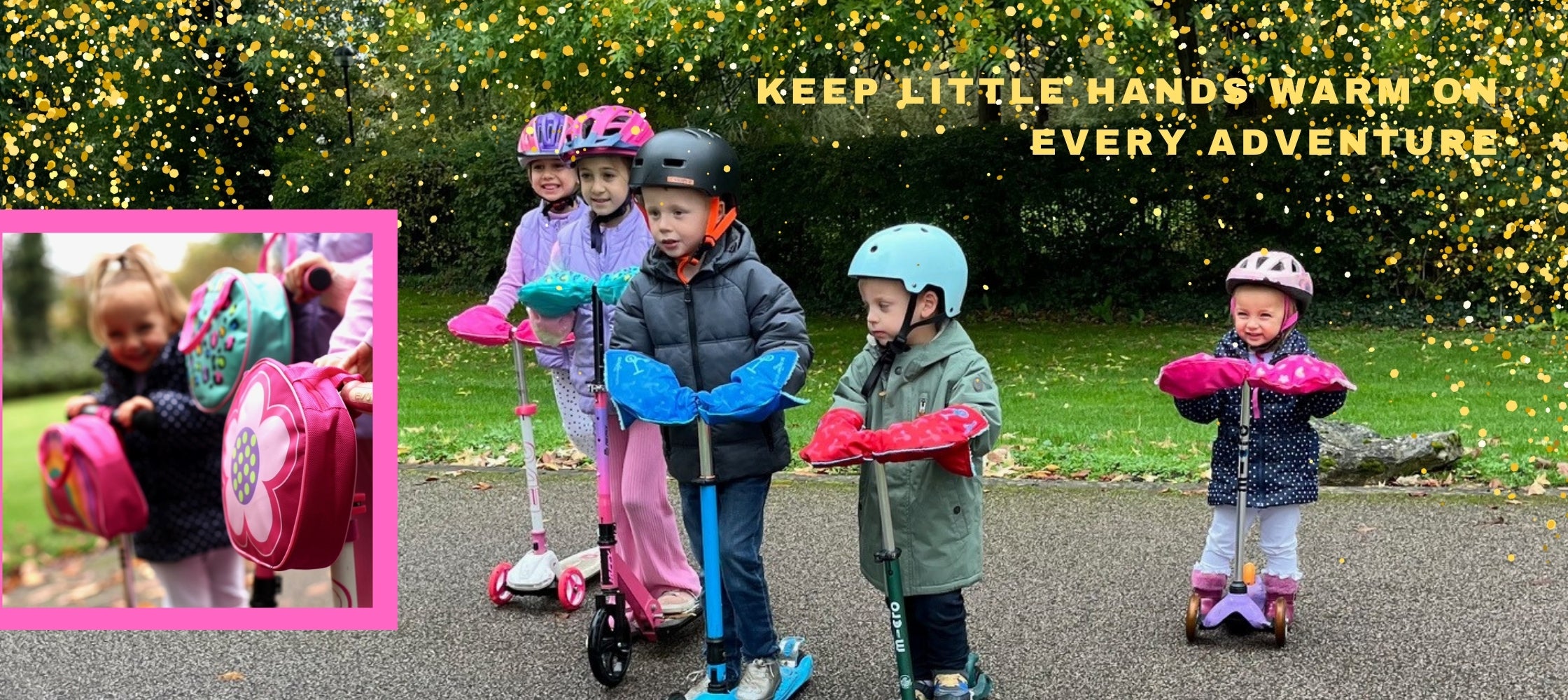 Scooterearz hand warmers stay attached to the scooter handlebars — so kids stay cosy, confident and excited to scoot, whatever the weather.