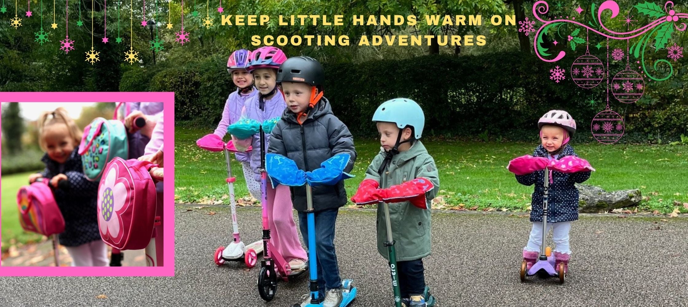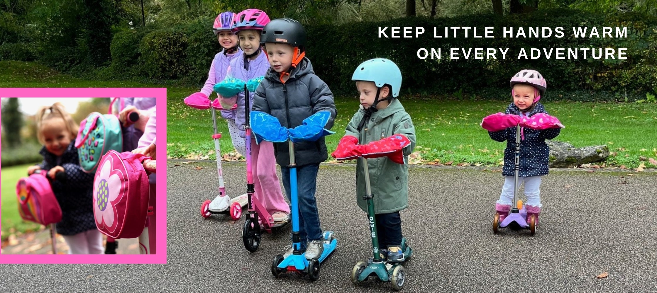 Scooterearz hand warmers stay attached to the scooter handlebars — so kids stay cosy and excited to scoot, whatever the weather.